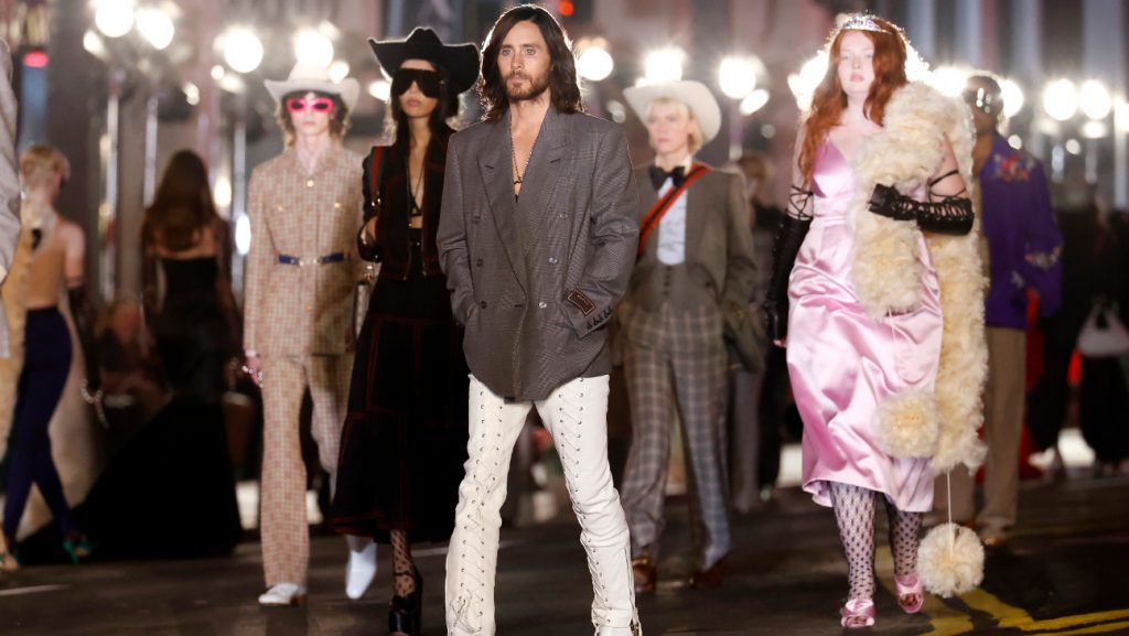 Para traer esta magia a la realidad, Gucci llevó a la pasarela a importantes nombres – y frecuentes colaboradores de la marca- para modelar las piezas: Jared Leto, Jodie Turner-Smith, St. Vincent, Jeremy Pope, entre otros. Macauly Culkin resultó ser una de las grandes sorpresas, al modelar un look de camisa hawaiana, Phoebe Bridgers lució un outfit inspirado en Jackie Kennedy y Miranda July exhibió un atuendo inspirado en las modelos pin-up.