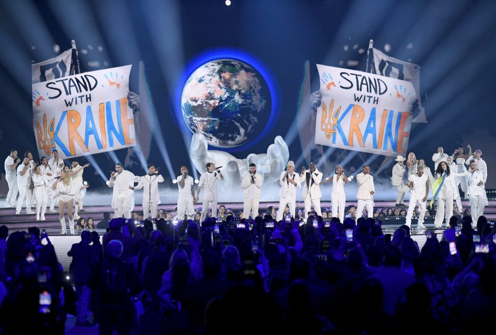 La gala, que se prolongó durante más de tres horas, comenzó con un mensaje de solidaridad con Ucrania de los Black Eyed Peas, con una revisión bilingüe de su canción “Where is the Love” (“Dónde está el amor”), en la que la cantante ucraniana NK participó y el resto de invitados se sumaron a la ceremonia.